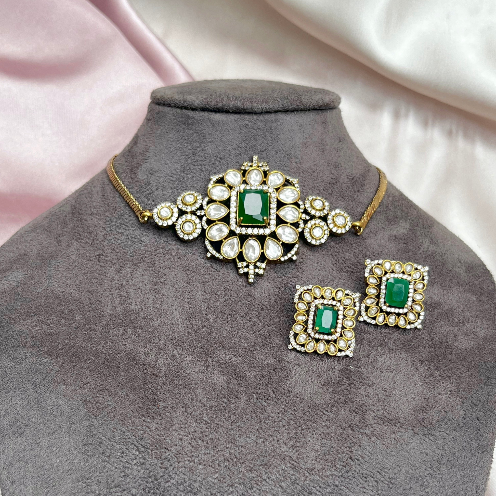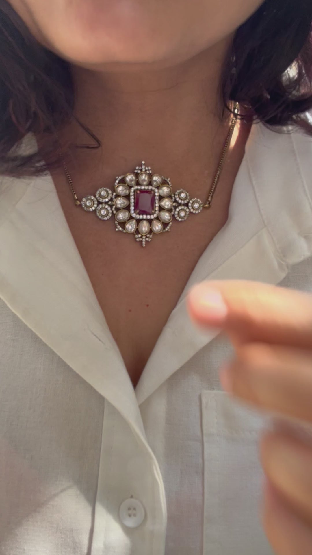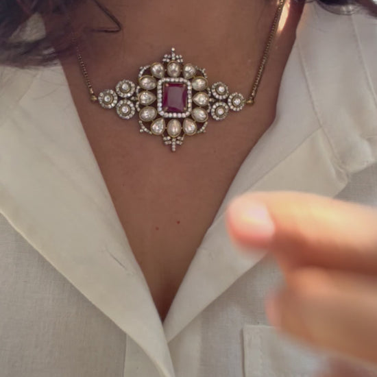 Exquisite choker set with Kundan stone and Ruby Red Stone as centerpiece, adorned with a Antique Finish, epitomizing traditional opulence and timeless allure