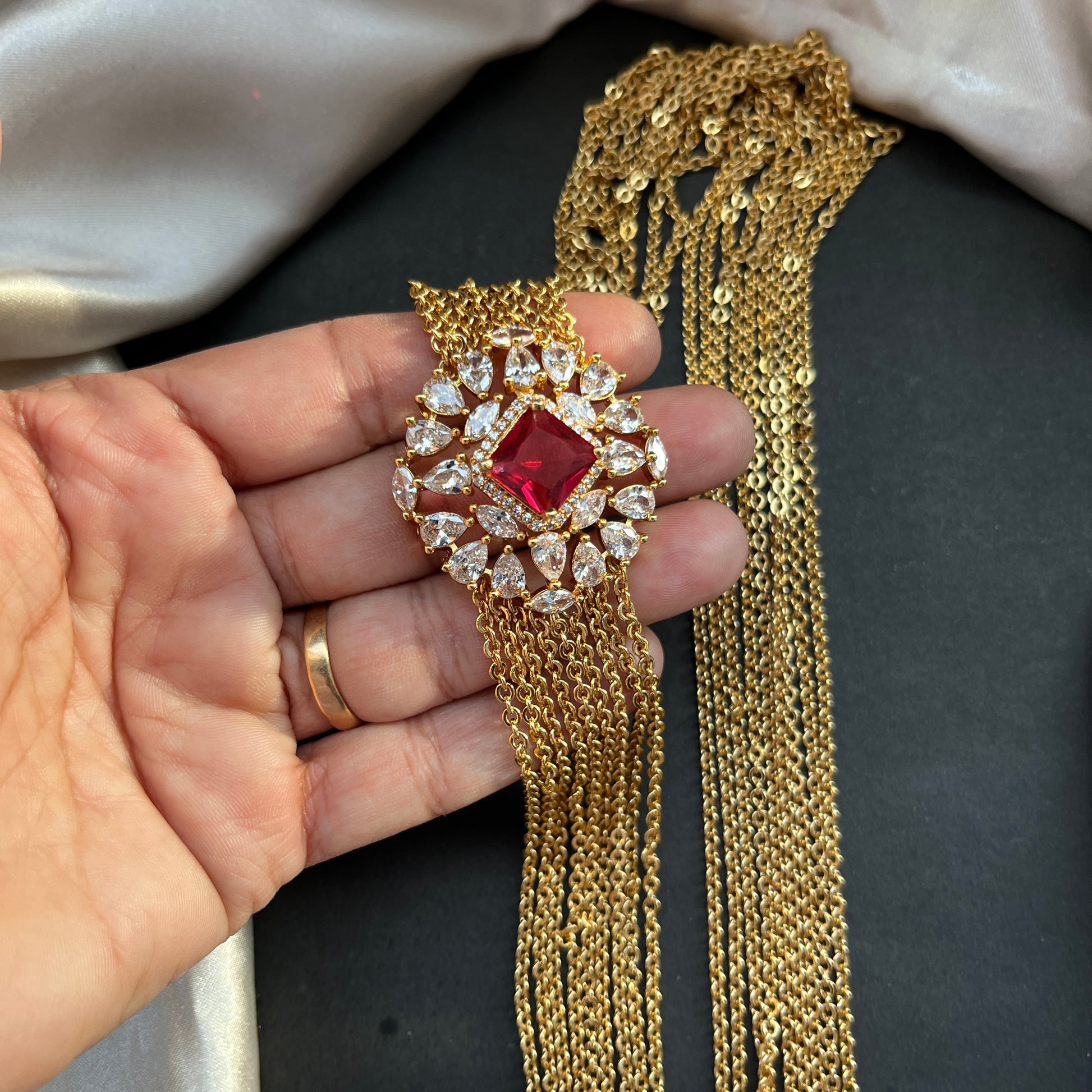 Stunning multi-layer Chandra Haram in premium one gram gold finish ,timeless blend of temple artistry and modern elegance, perfect for bridal, festive, and traditional styling