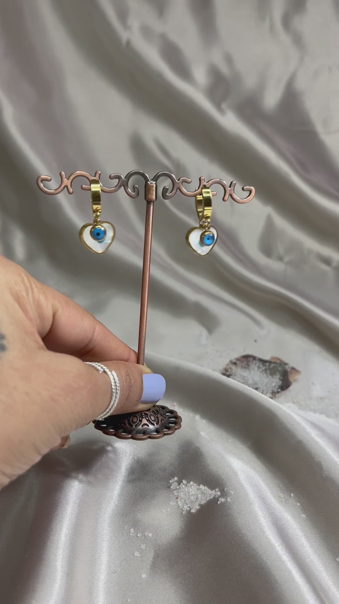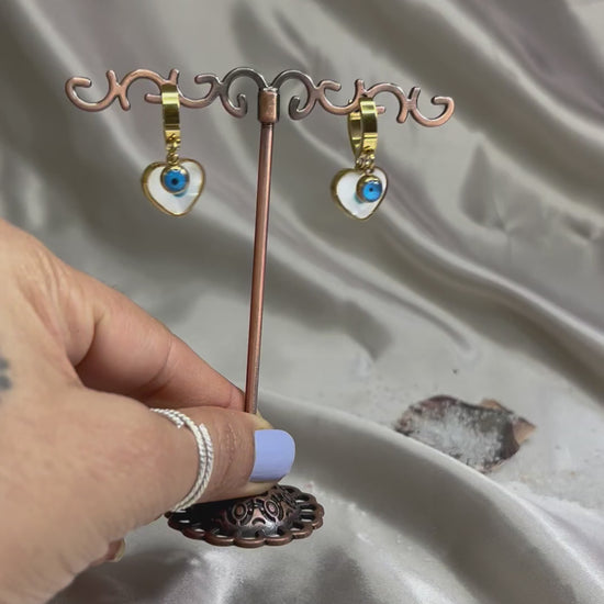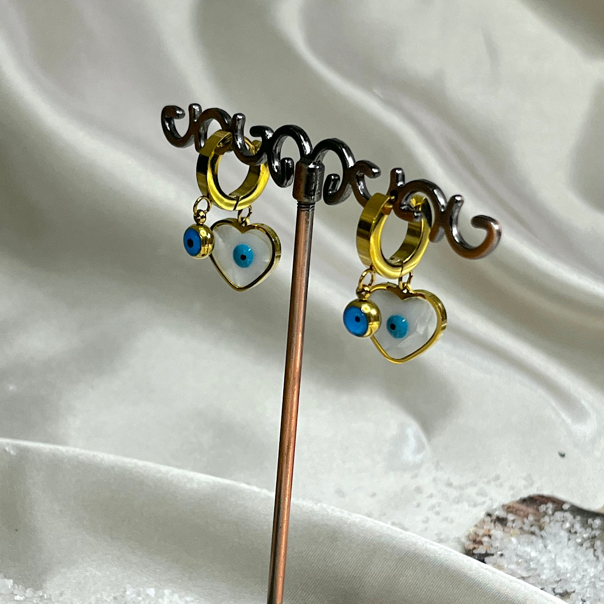 Elevate your style with these enchanting gold-tone earrings featuring a heart motif and warding off the evil eye!