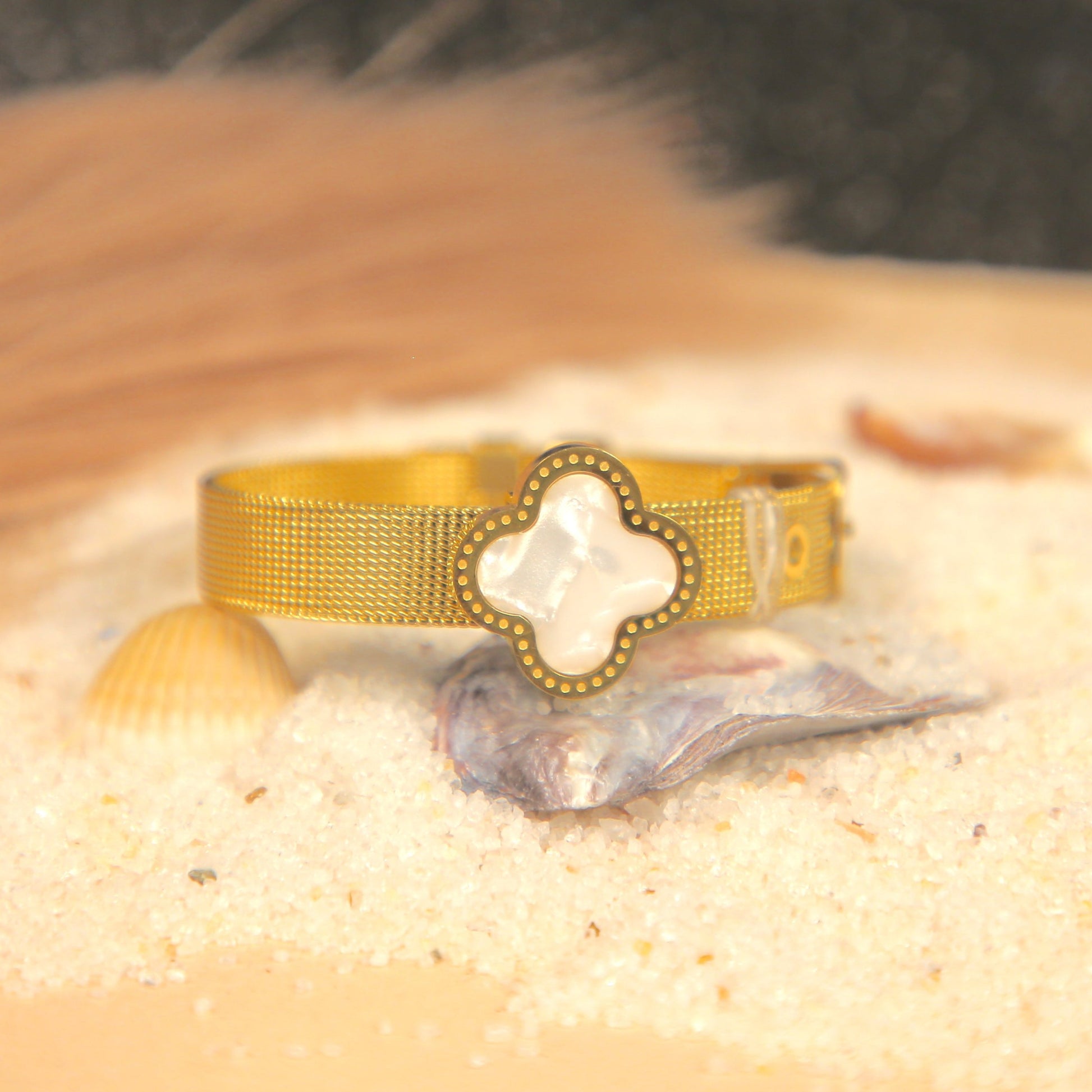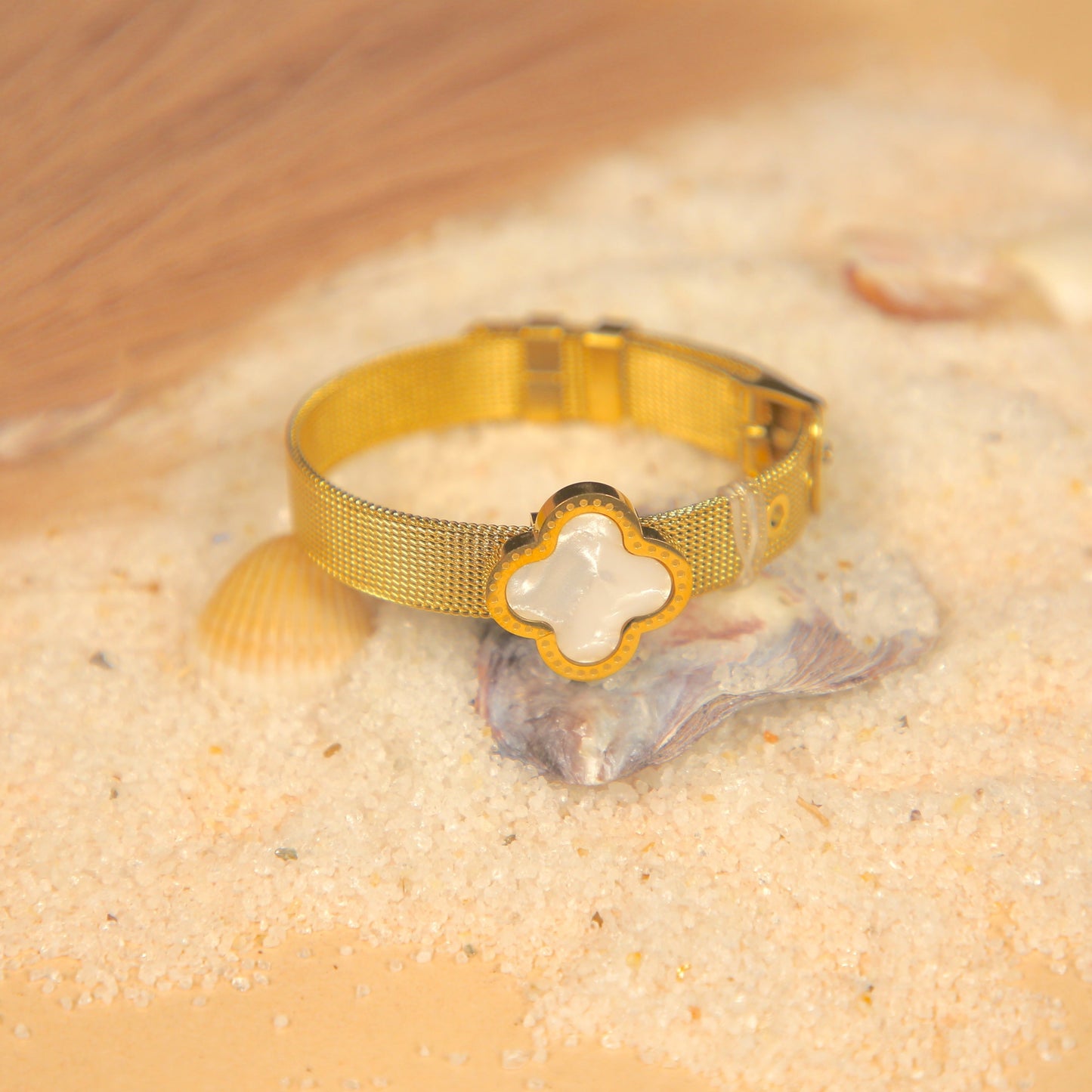 This elegant and versatile Lucky Clover Bangle Bracelet features a beautiful white maple leaf motif, adding a touch of natural beauty to any outfit. With a unique watch style design, it is not only a fashion statement but also a functional accessory.