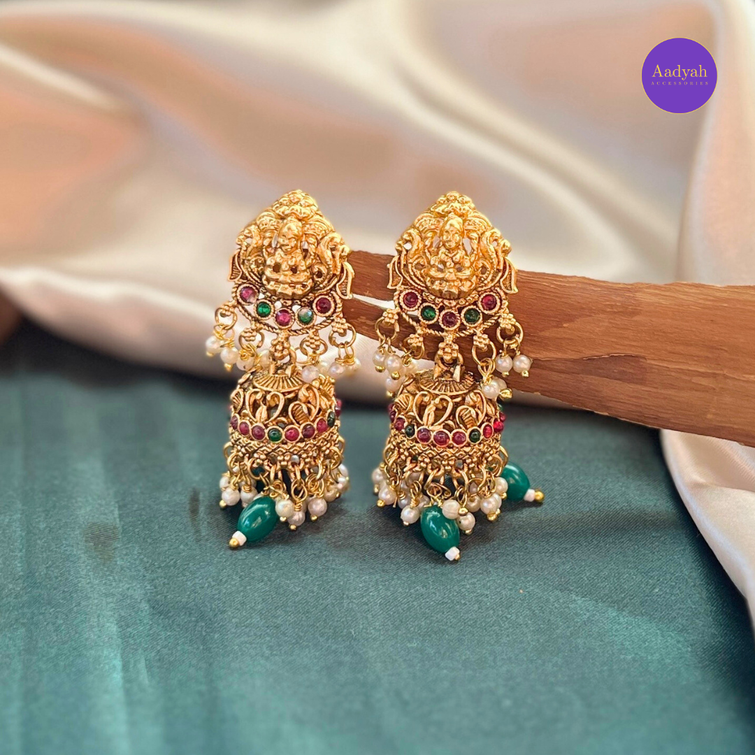 Accented with green bead drops and delicate pearl hangings that enhance its rich traditional appeal.